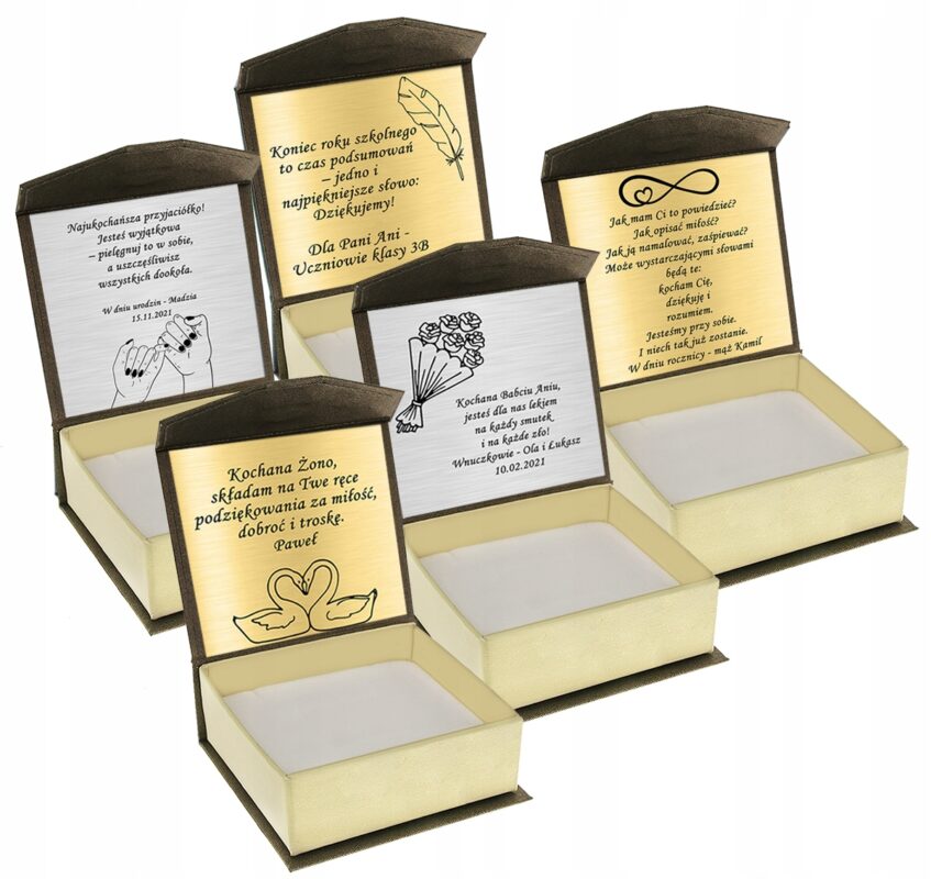 Możesz też skorzystać z pudełka z szablonami życzeń – wówczas podajesz nam tylko niezbędne dane do uzupełnienia w grawerze!