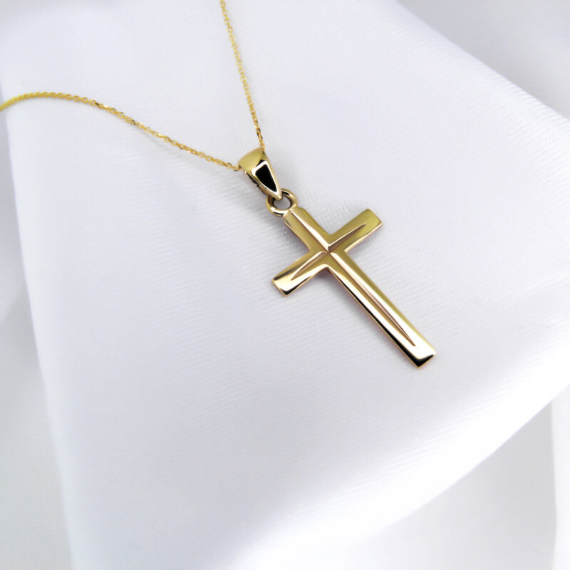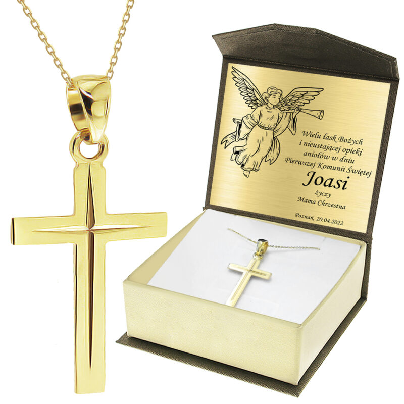 Ze złota warto również wybrać komplet łańcuszka z krzyżykiem. Jest to świetny pomysł na prezent na chrzciny. W naszej ofercie znajdą Państwo specjalnie przygotowane zestawy zawierające już piękne, personalizowane pudełko z dedykacją.